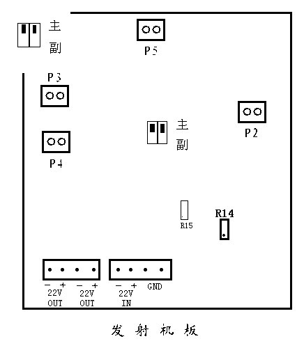 4.接線完畢后,注意(上圖所示)的JP2,JP3兩個主副設置.主發射板這兩個跳線都設置主發射位置.副發射板兩個跳線都設置在下面副發射位置.