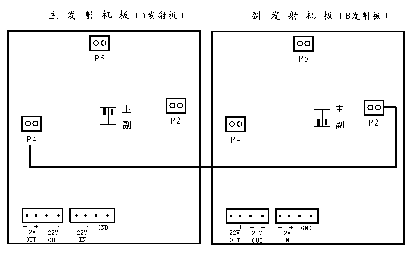 3、(上圖所示)當A發射板作主發射板時,聯機線在A發射板上接P4接線座。B發射板上接P2接線座。(反之:當B發射板作主發射板時,聯機線在B發射板上接P4接線座。A發射板上接P2接線座。)